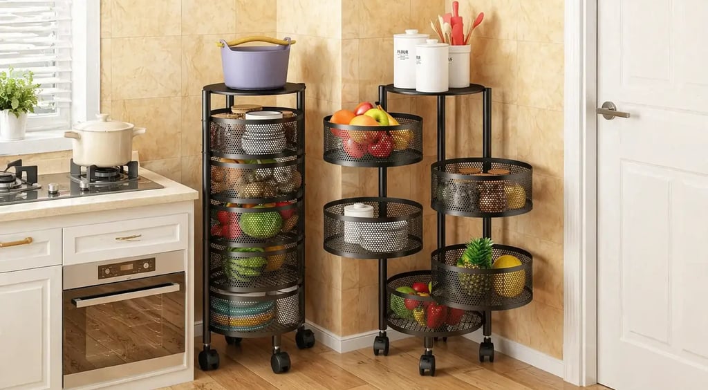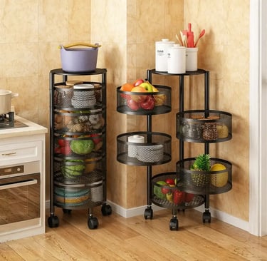 Essa fruteira vertical tem cestos giratórios que abrem um por um, facilitando guardar e pegar os alimentos, e ainda tem rodinhas pra mover quando precisar.
