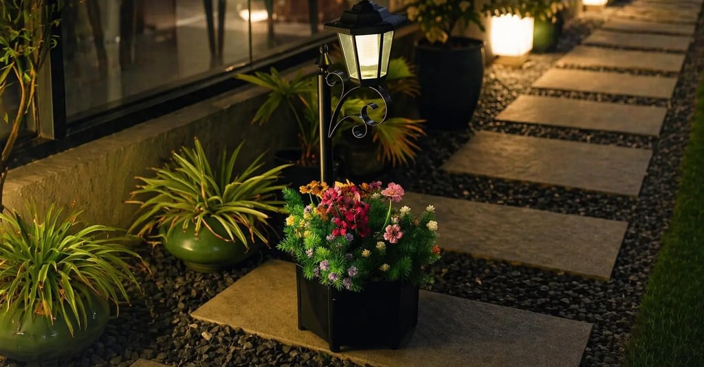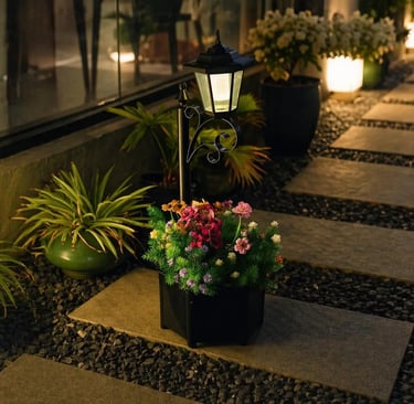 Essa luminária solar tem placas no topo pra carregar sozinha e um suporte pra apoiar vasos ou flores, deixando tudo mais prático no jardim ou na varanda.
