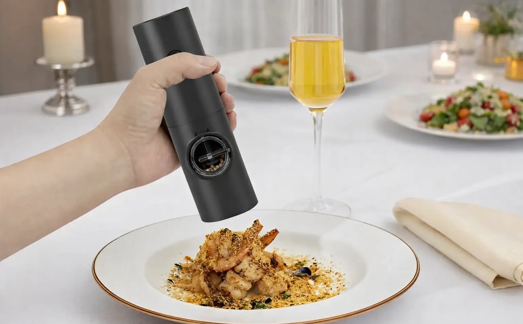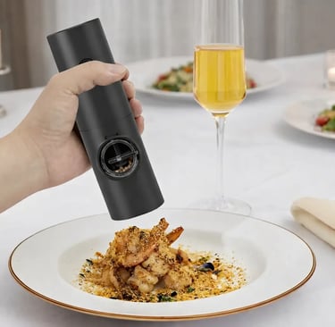 Esse moedor elétrico é só colocar sal ou pimenta no compartimento e apertar o botão. Ele ainda tem ajuste pra moagem mais fina ou mais grossa.