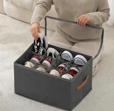 Esse organizador guarda até 6 pares, tem divisórias pra manter tudo no lugar e tampa transparente com zíper pra proteger.