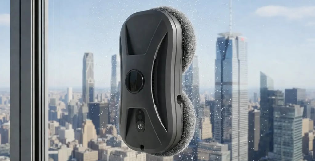 Esse robô limpa com panos de microfibra, fica preso no vidro por sucção e usa sensores pra detectar bordas e obstáculos, com segurança contra quedas.